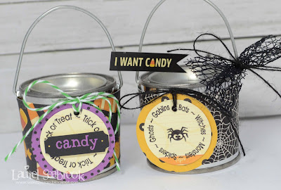Next up, I used the Tricks & Treats collection by Pebbles to create these little goodie tins for my girls at Halloween (they are 15 and 18 so I will probably tuck in some $$ with the candy). The Stampin' Around Fall Stamp Set was perfect for creating little labels for the tins.